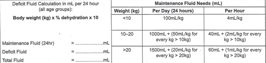 He has commenced on two antibiotics and parental rehydration according to guidelines. At 9.00, you give a dose of Paracetamol and commence the IV parental fluid. The standard dosing for Paracetamol is 15mg/kg, and it comes in strawberry flavour at 24mg/ml.